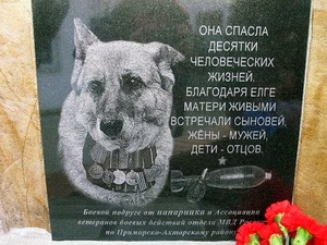 En la pequeña ciudad rusa de Primorsko, junto al monumento a los militares muertos en acto de servicio, encontramos una placa que nos recuerda a Elga, una perra pastór alemán especializada en la detección de explosivos.